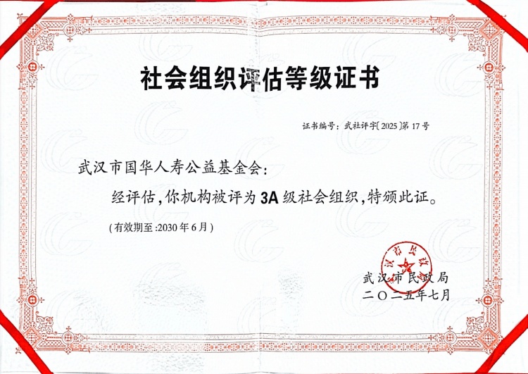 2025年7月,在武汉市民政局公示的2024年度首批市级社会组织评估等级名单中,武汉市国华人寿公益基金会名列其中,成功获评市级3A社会组织。此项荣誉标志着该基金会在内部治理、专业服务与社会影响力等方面建设的成熟度已获得政府部门的高度肯定。