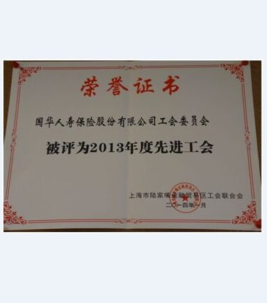 2014年1月22日,在上海市陆家嘴金融贸易区工会联合会举办的“2013年度模范先进、达标工会表彰大会”上,国华人寿工会委员会凭借在2013年工会工作中的杰出表现,获得“2013年度先进工会”。