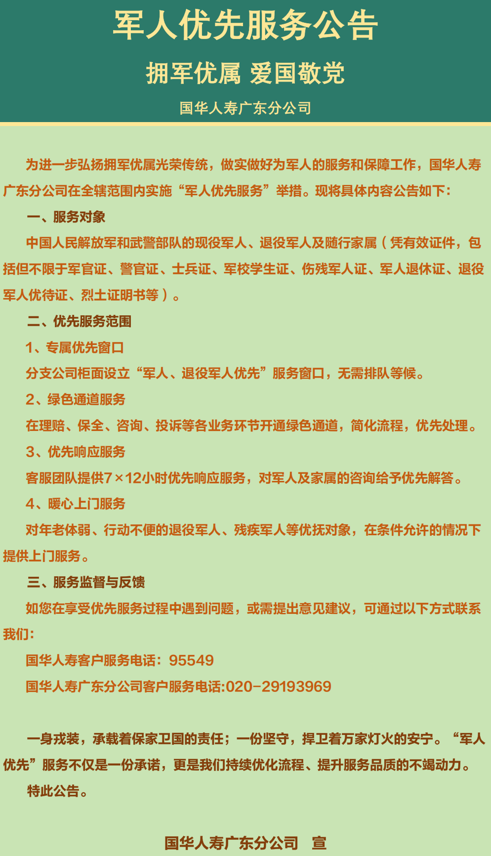 【国华人寿广东分公司】军人优先服务公告