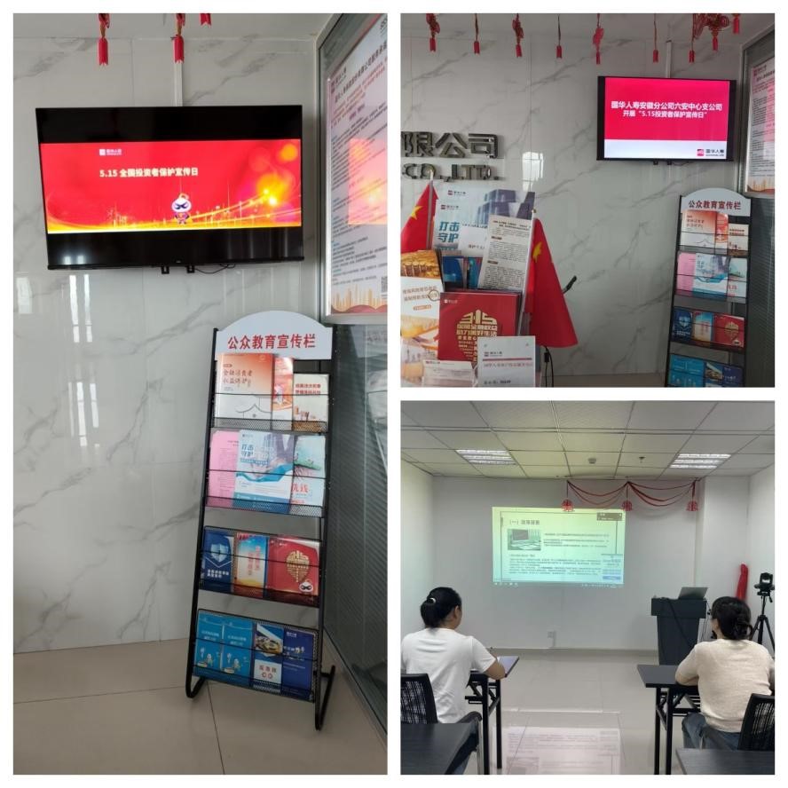 本次活动线上线下同步推进:线上方面,我司通过官方公众号发布风险提示和以案说险宣传文案,让员工分享微信朋友圈,让广大金融投资者和消费者关注和了解。线下方面,我司在职场大厅电视屏播放“5·15全国投资者保护宣传日”宣传标语,循环播放防范风险短视频,设置“公众教育宣传栏”,放置反洗钱、防范非法集资、防范电信网络诈骗等相关宣传手册供客户阅读翻看,营造浓厚的宣传氛围。同时,提醒上门办业务的客户和内外勤员工远离非法推荐股票基金期货、非法代客理财等行为,警惕“保本高收益”等虚假宣传,增强风险意识和防范能力,提示消费者通过正规渠道进行投资。