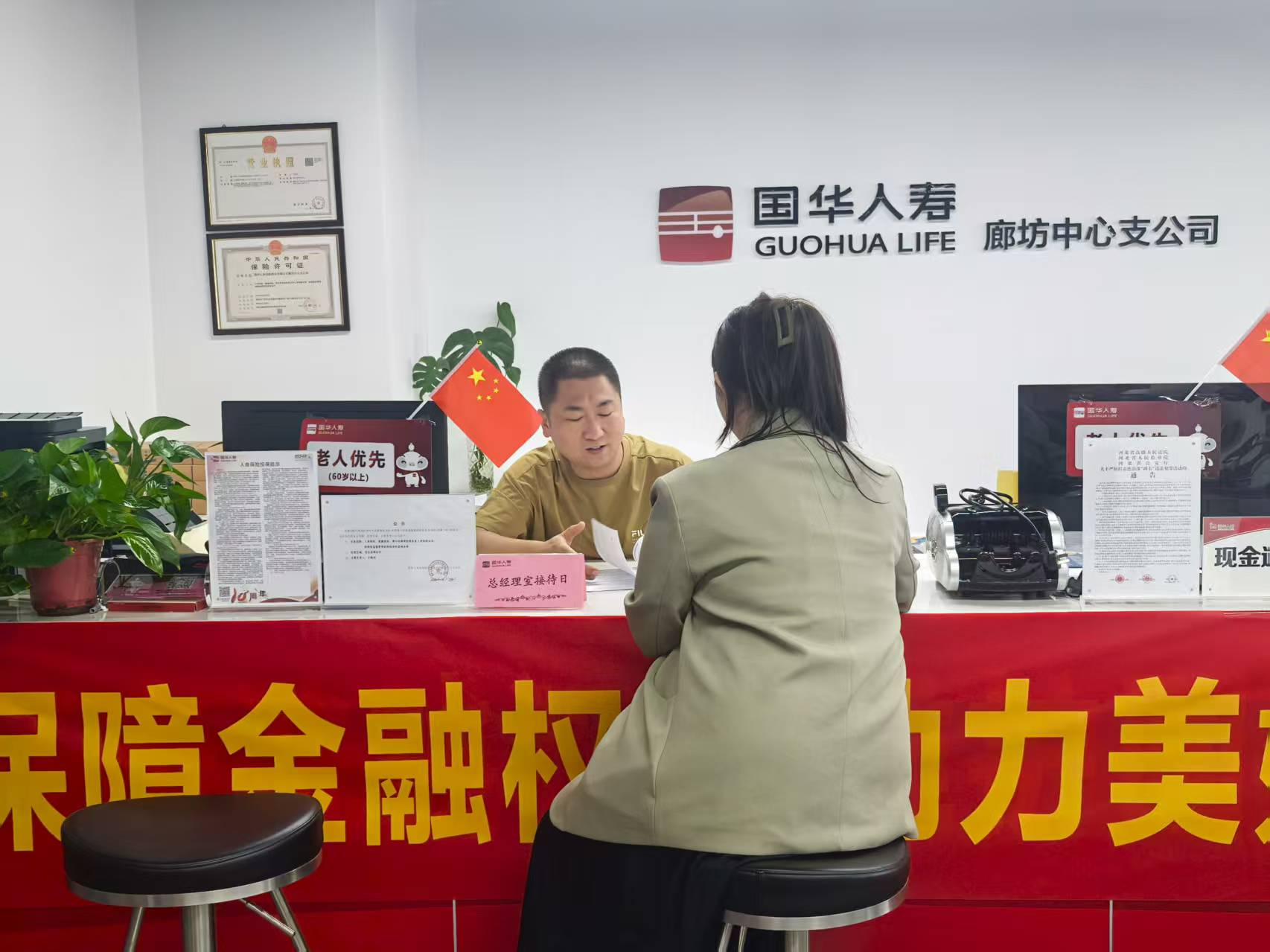 2025-09-17为深入贯彻“保障金融权益,助力美好生活”理念,2025年9月17日,国华人寿河北分公司廊坊中支开展总经理接待日专题活动。