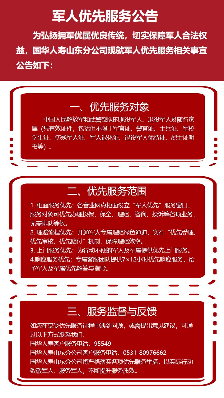 【国华人寿山东分公司】为军人提供优先服务的公告
