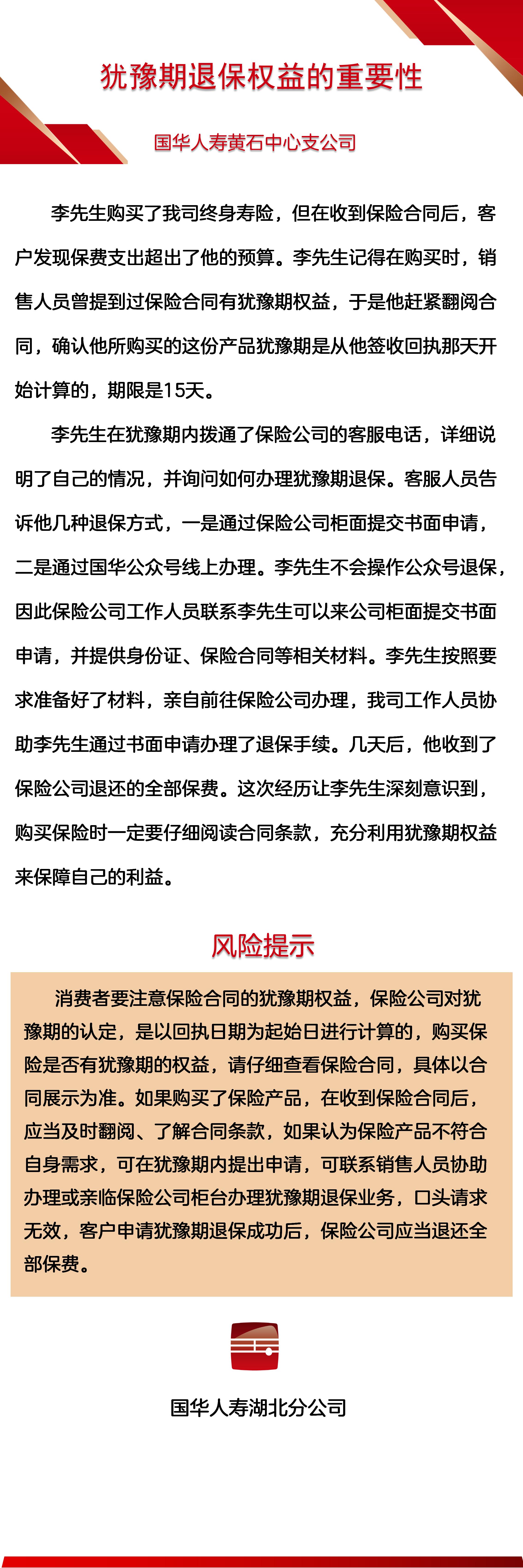 国华人寿湖北分公司黄石中支:以案说险+犹豫期退保权益的重要性